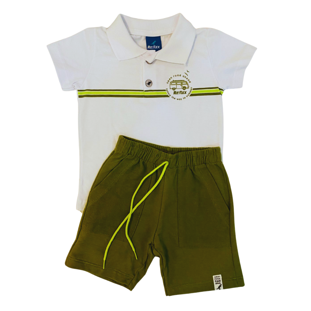 Conjunto Camiseta Gola Polo e Bermuda Moletom com Bolso 01/02/03 Branco