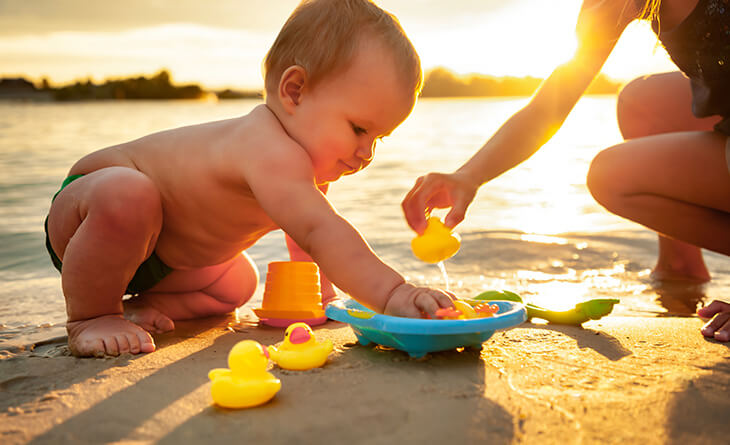 Leve brinquedos próprios para a praia, conforme a idade do bebê. Lembre-se também de levar algo no qual o bebê possa se sentar, não é adequado deixá-lo sentado diretamente na areia, isso pode elevar o risco de assaduras e infecções por fungos e bactérias. Uma boa ideia é levar uma piscina inflável, para garantir a diversão e manter o bebê em um ambiente controlado.